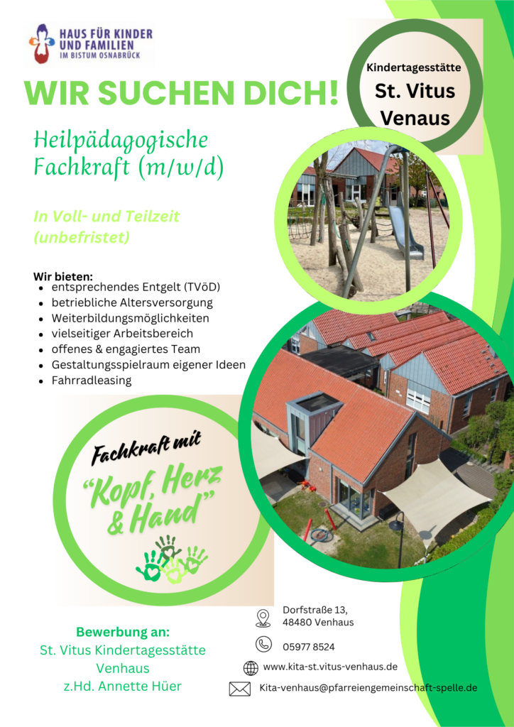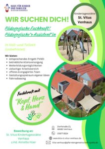 Die Kindertagesstätte St. Vitus Venhaus ist eine katholische Einrichtung, jedoch offen für alle Religionen und Nationalitäten. Unsere pädagogische Arbeit ist geprägt vom christlichen Menschenbild: Jeder Mensch ist ein Geschöpf Gottes und von Gott gewollt.